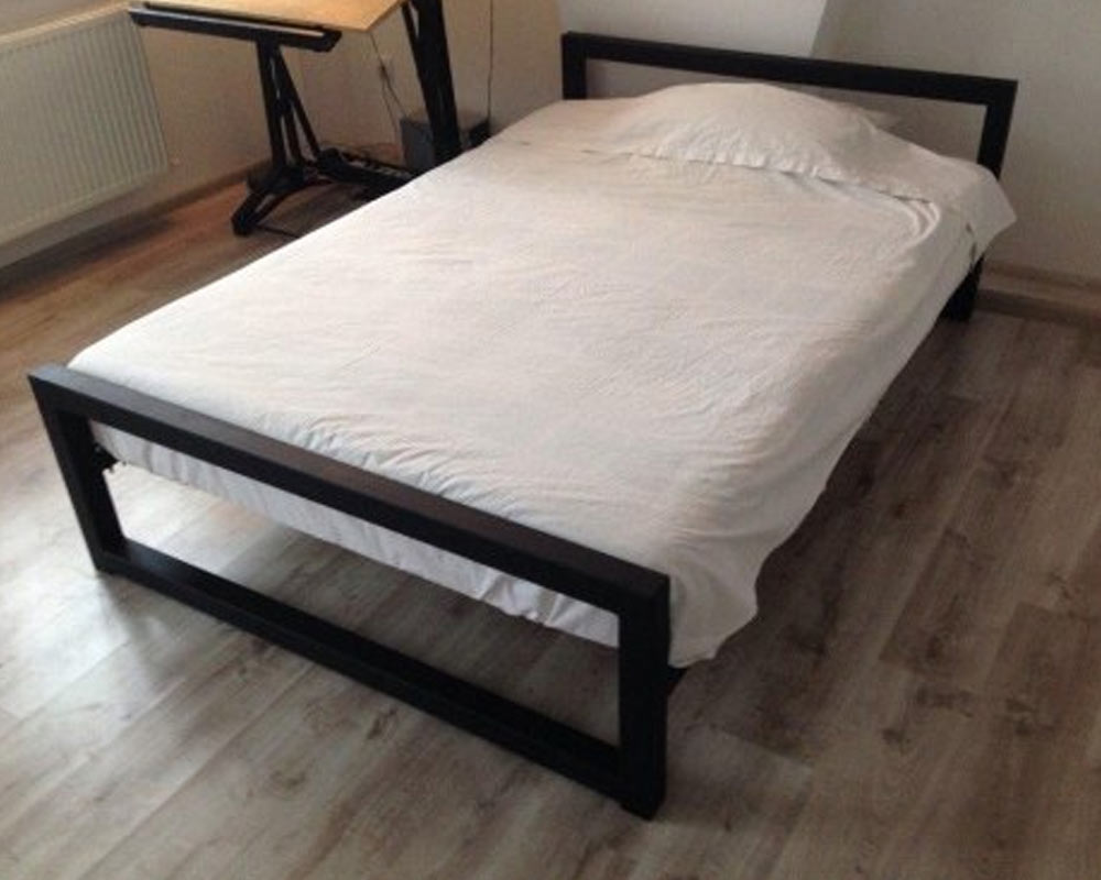 Спинка самых интересных моделей выполнена в виде деревянных или металлических прямоугольных контуров, которые в некоторых случаях имеют дополнительные изгибы под прямым углом. Визуально они разграничивают пространство, но не так резко, как сплошные плоскости дерева или металла. В комплекте к кровати часто прилагается тумбочка с соответствующим оформлением.